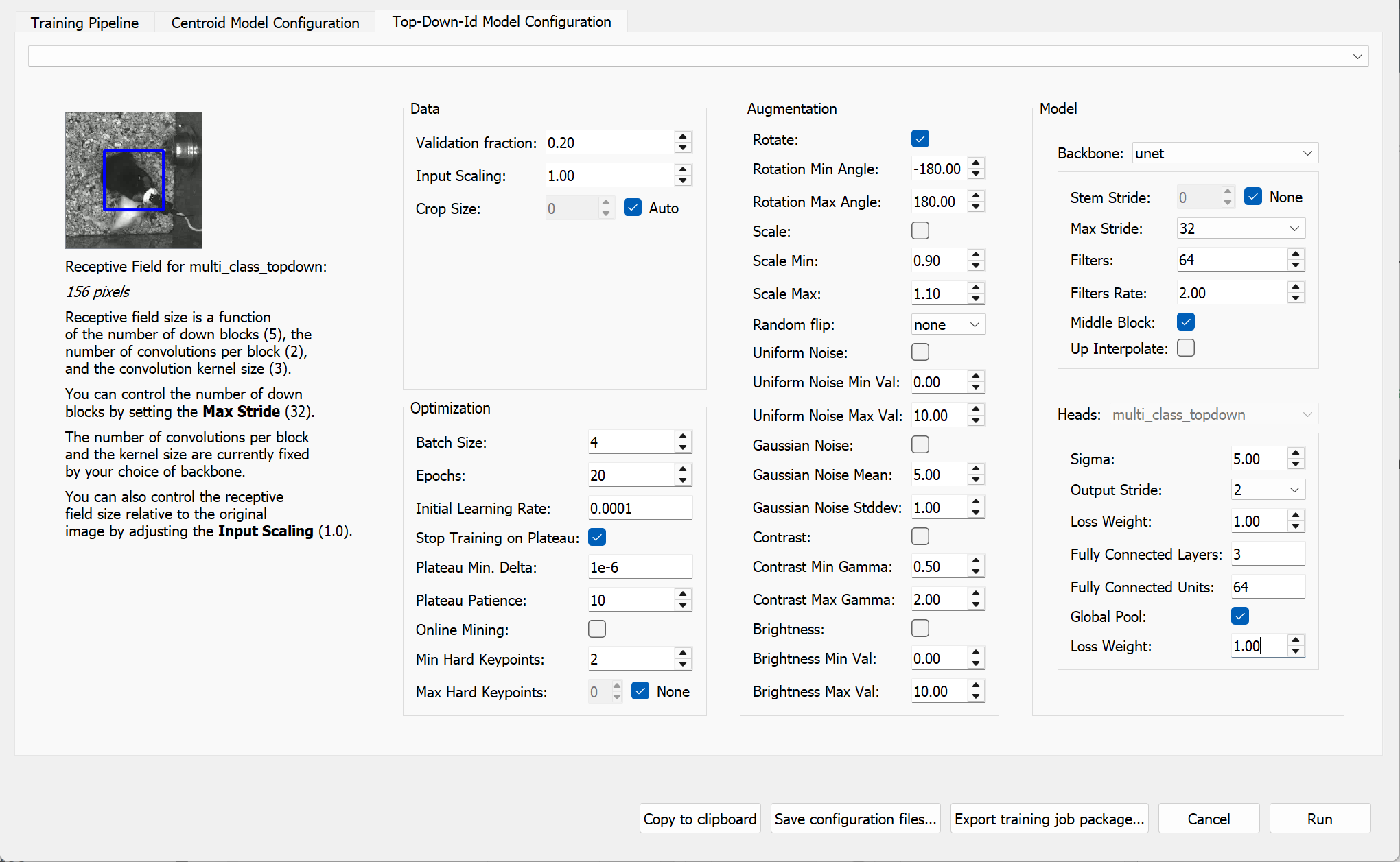 For top-down models, set a larger receptive field for the centroid model (by decreasing the “Input Scaling” value) than for the top-down ID model, since you only need to locate the animal, not fine details.