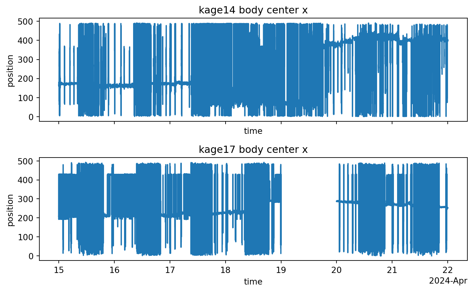 Using this information, we were able to reconstruct precise datetime coordinates for all frames throughout the entire experiment. We then concatenated the DeepLabCut predictions from all video segments and assigned the datetime coordinates to the resulting dataset. If you’re interested in the details, you can find the code in the smart-kages-movement GitHub repository.