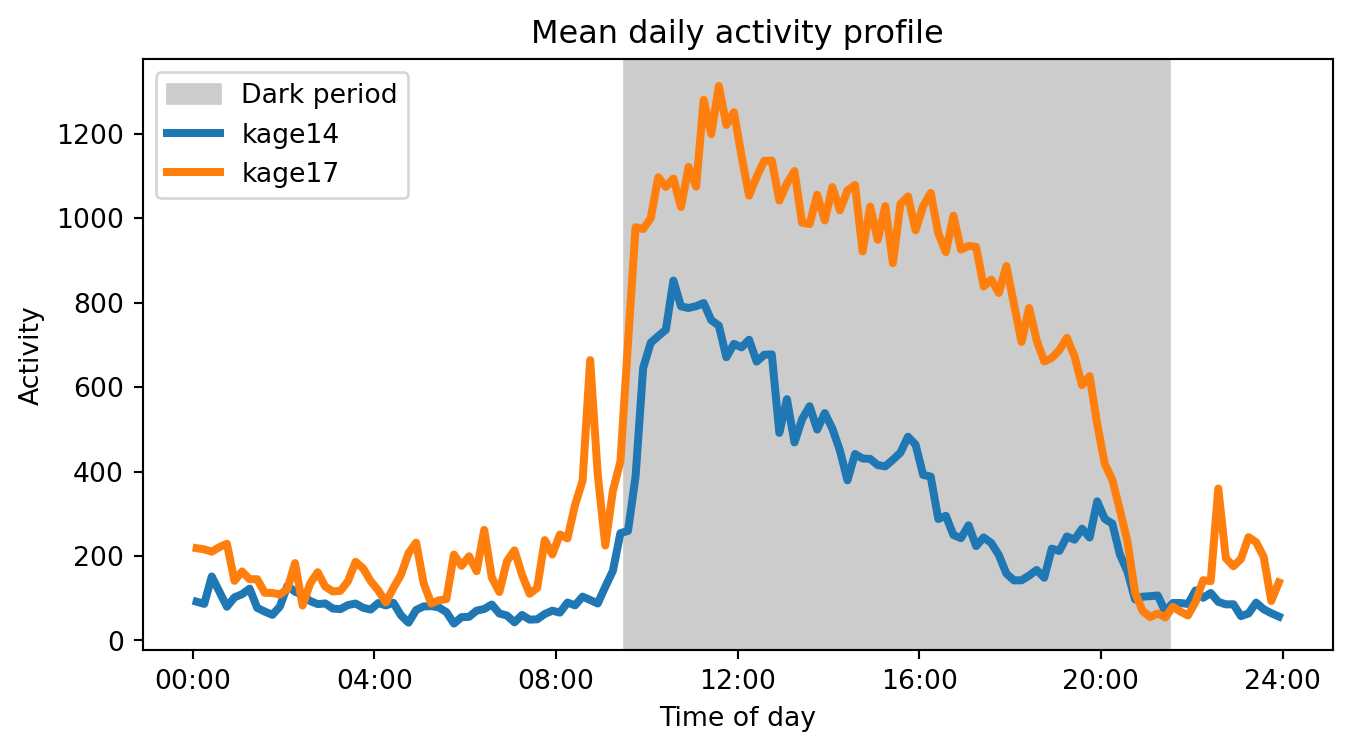 As we would expect, both mice tend to spend more time on the running wheel during the dark (active) periods.