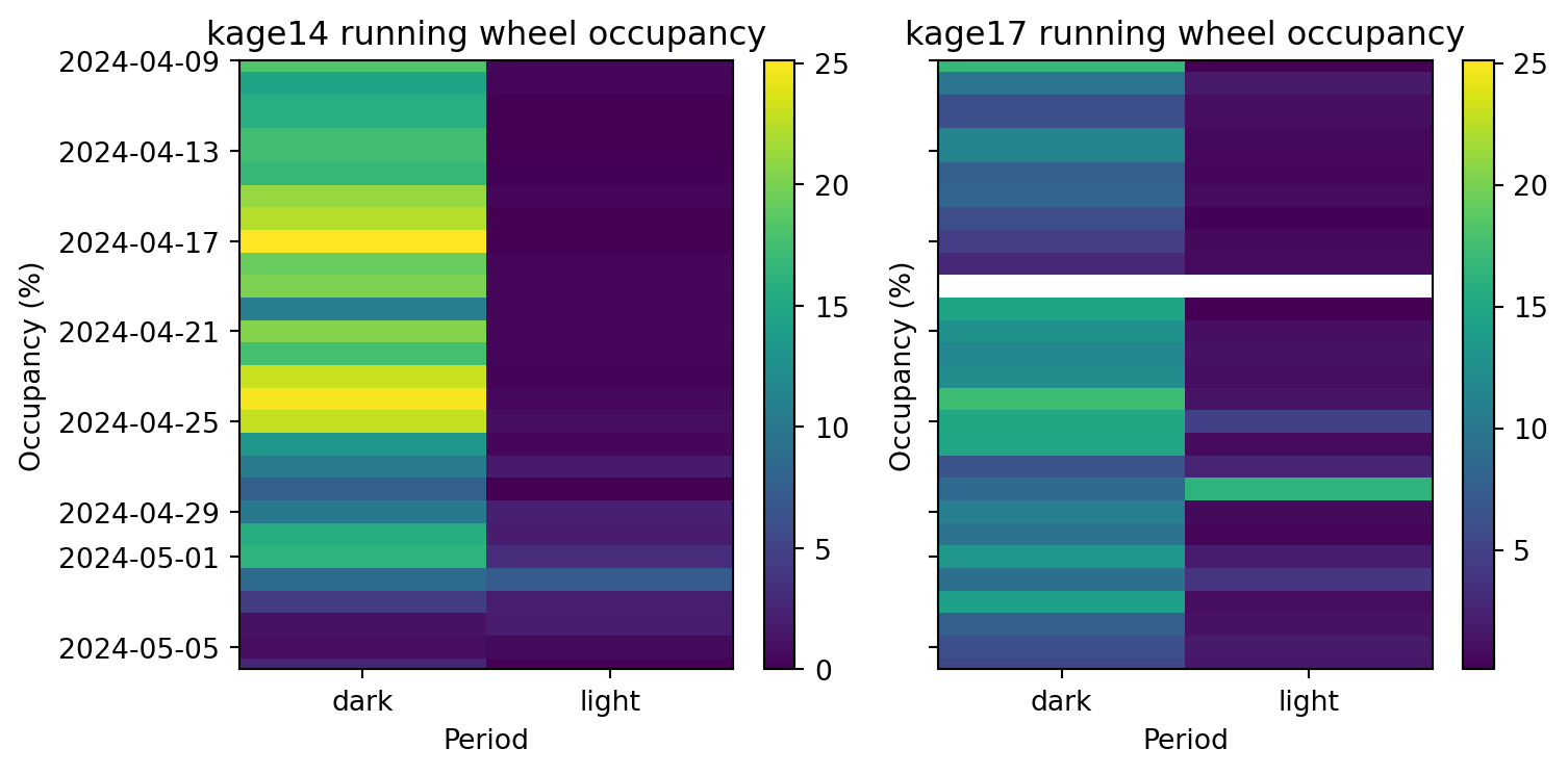 But how does the running wheel occupancy relate to the light cycle? We can segment the ROI occupancy data into dark and light periods for each day and compute the % of time spent on the running wheel during each period.